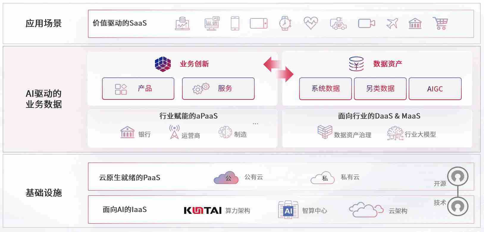 数字时代,,,围绕企业数字化转型的关键要素,,,伟德国际1946bv数码开创性的提出数云融合战略和技术体系框架,,着力在云原生、、、、数字原生、、AI原生和信创产业上架构产品和服务能力,,,为处在不同数字化转型阶段的快消零售、、、汽车、、、金融、、、医疗、、政企、、教育、、、、运营商等行业客户提供泛在的敏捷IT能力和融合的数据驱动能力,,,构建跨界融合创新的数字业务场景和新业务模式,,助力企业级客户建立面向未来的核心能力和竞争优势,,全面推动社会的数字化、、智能化转型升级。。